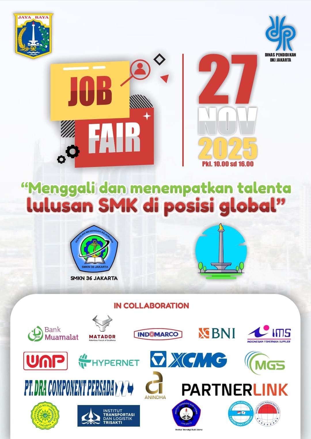 Jakarta, 27 November 2025 — SMK Negeri 36 Jakarta kembali menyelenggarakan Job Fair 2025, sebuah kegiatan strategis yang menjadi jembatan antara lulusan sekolah dan dunia kerja. Bertempat di aula utama sekolah, kegiatan berlangsung dari pukul 10.00 hingga 16.00 dan diikuti oleh puluhan perusahaan mitra dari berbagai sektor.